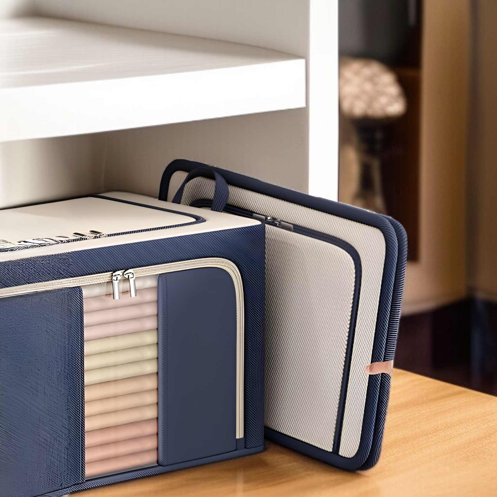 ● Faltbare Kleideraufbewahrungsbox mit robustem Stahlrahmen sorgt für höchste Stabilität und eine langlebige Nutzung im Alltag. ● Praktische dreiseitige Öffnung ermöglicht einen bequemen Zugriff auf Ihre Kleidung und Futons, ohne die Box komplett zu entleeren. ● Stapelbares Design spart wertvollen Platz im Kleiderschrank und sorgt für eine ordentliche und übersichtliche Aufbewahrung. ● Ideal für Futons, Decken oder saisonale Kleidung – schützt zuverlässig vor Staub, Feuchtigkeit und Schmutz.